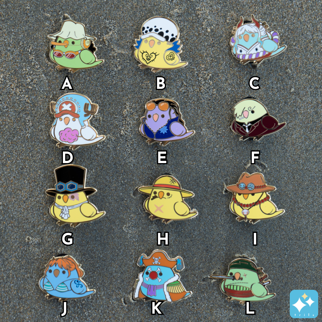 12 unique pirate parrot enamel pins that can be accessorized on your clothing, bags, lanyards, or whatever you choose.